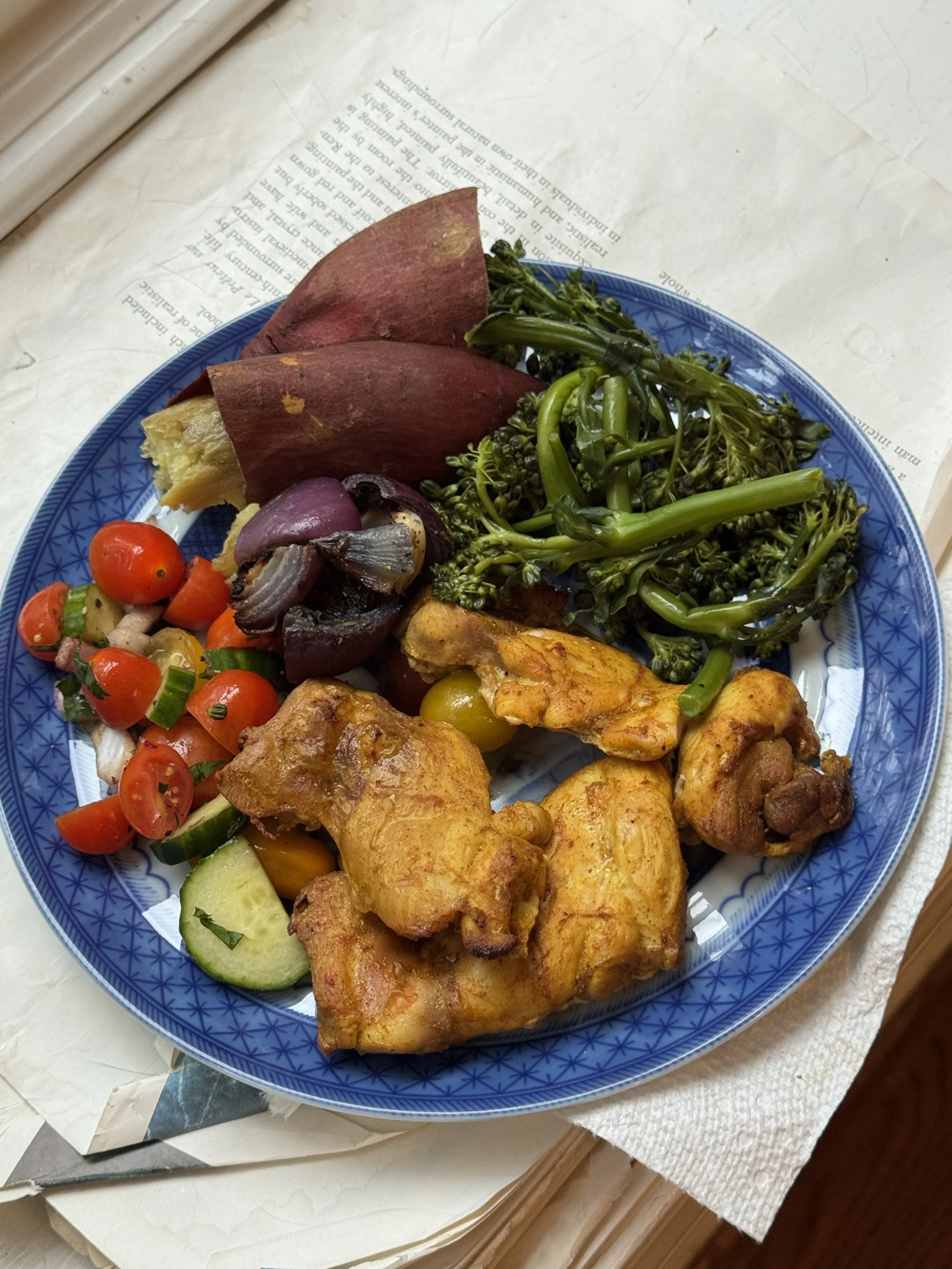 Chicken Shawarma, Tomato Cucumber Salad, Roasted Japanese Sweet Potato, and Blanched Broccolini