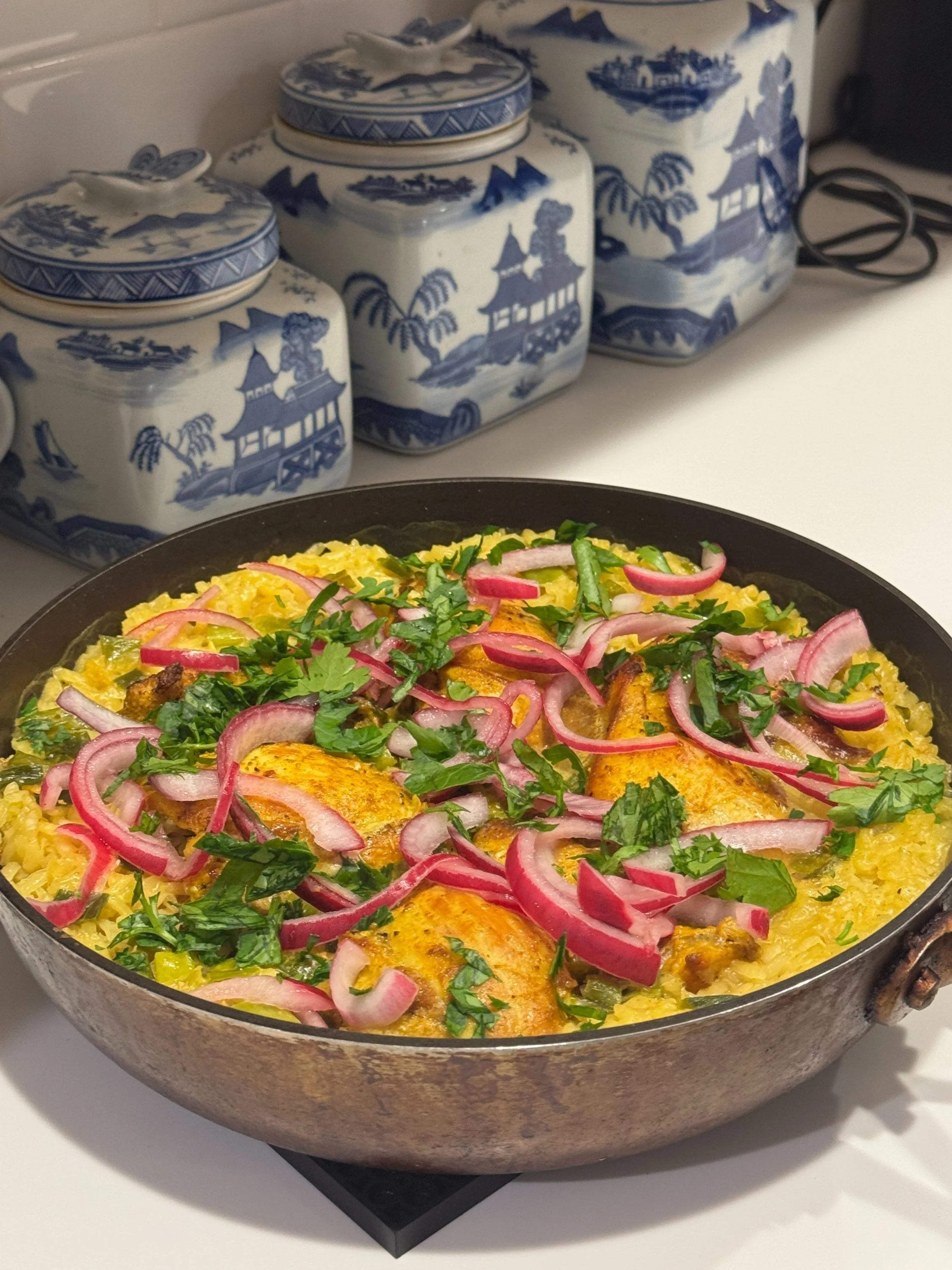 I love any chicken and rice recipe, but this Creamy Turmeric Chicken and Rice dish is one of my favorites. This one-pot meal creates a flavorful fusion of warm spices and creamy coconut richness. on top of this, the garnish of tangly pickled red onions and sprinkles of parsley gives the dish a refreshing contrast.