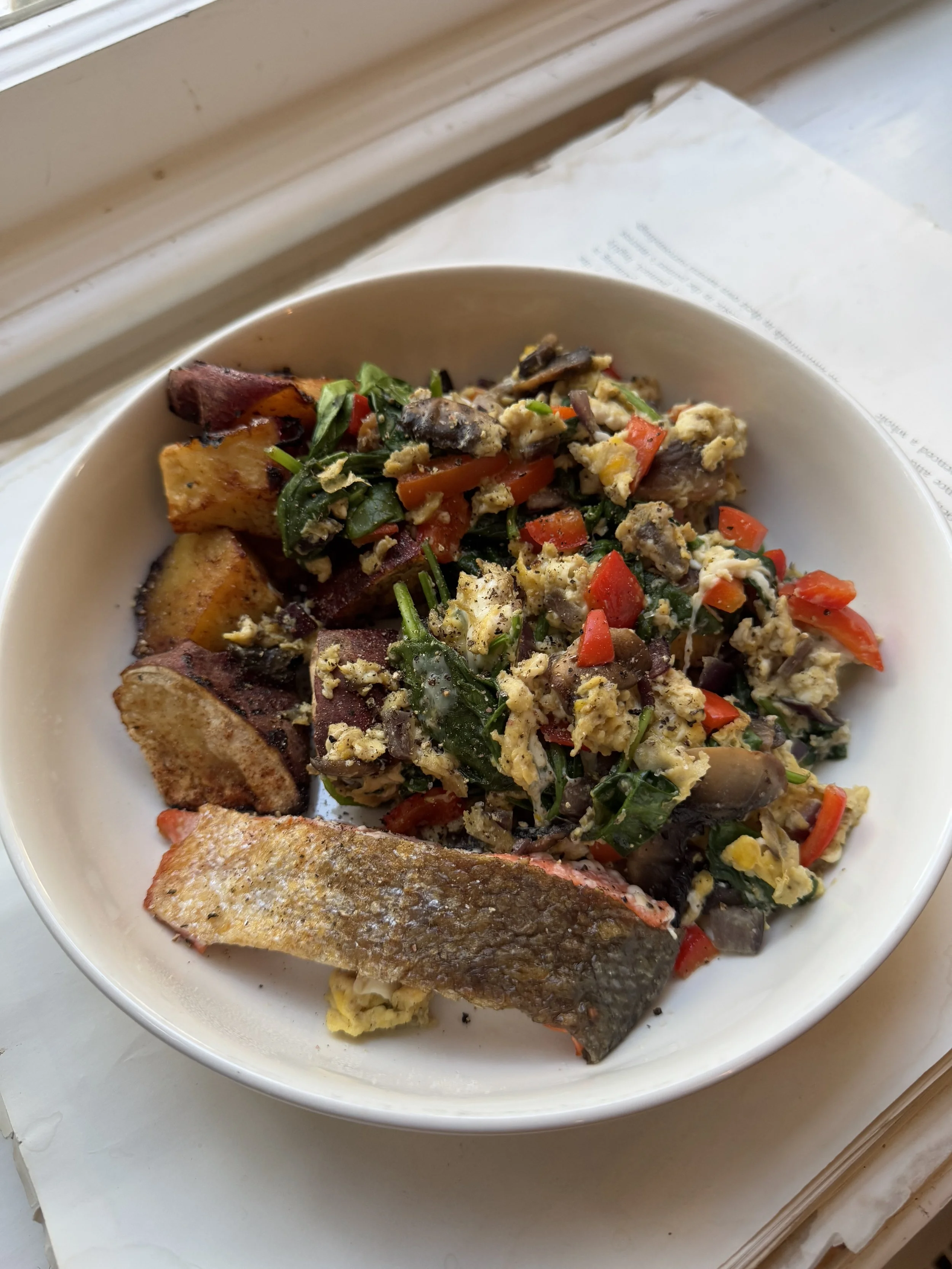 Combine your scrambled eggs, cooked potatoes, and seared salmon on a plate, and enjoy!