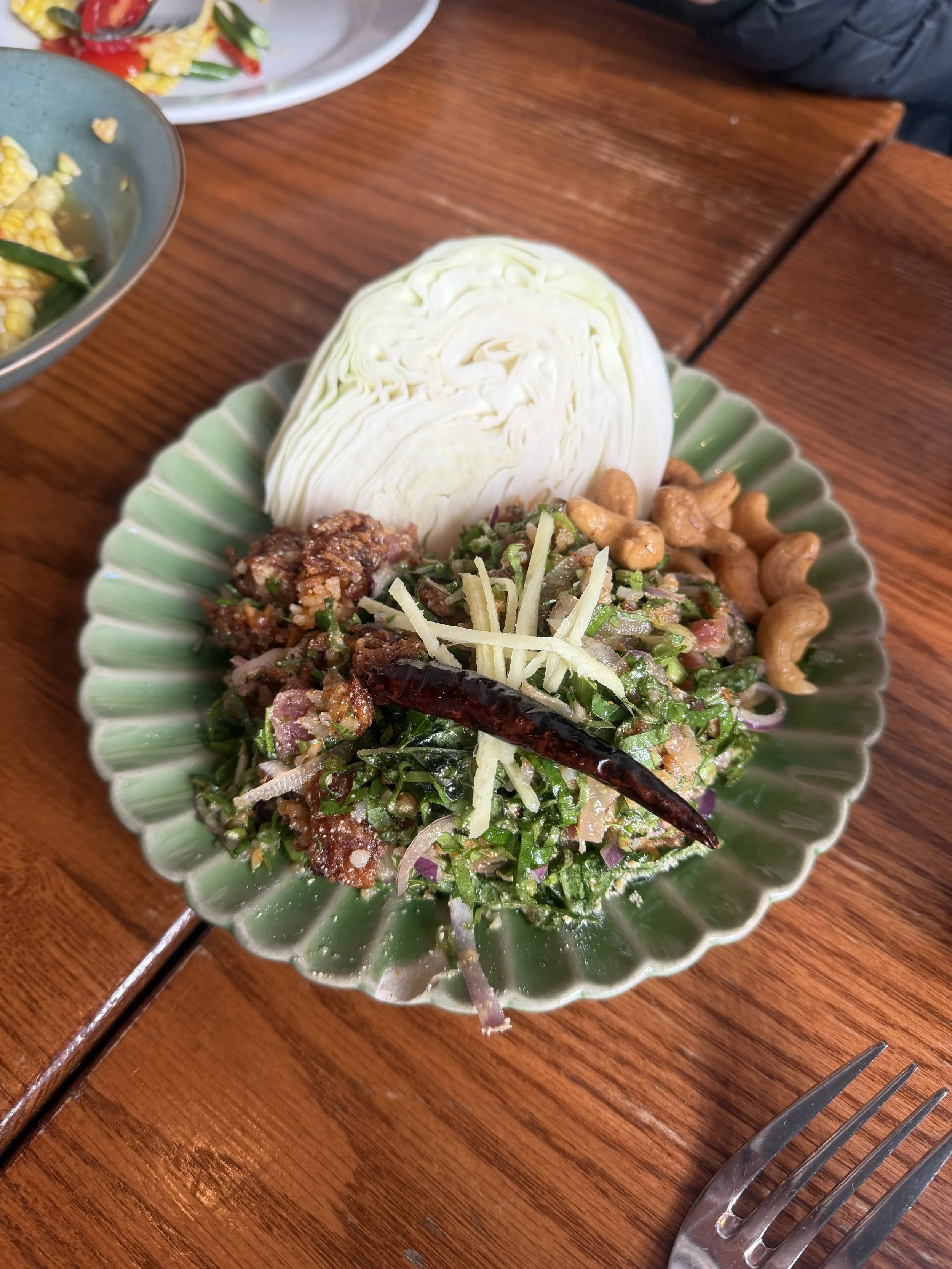 The crispy rice salad, meanwhile, delivered texture in every bite. The seasoned rice, coconut, chilis, pork, and medley of herbs created a dynamic contrast of crunch and spice. I will say that the mint leaned slightly overpowering at times, briefly overshadowing some of the more delicate flavors. Still, this was a minor note in what was otherwise an exceptional dish.